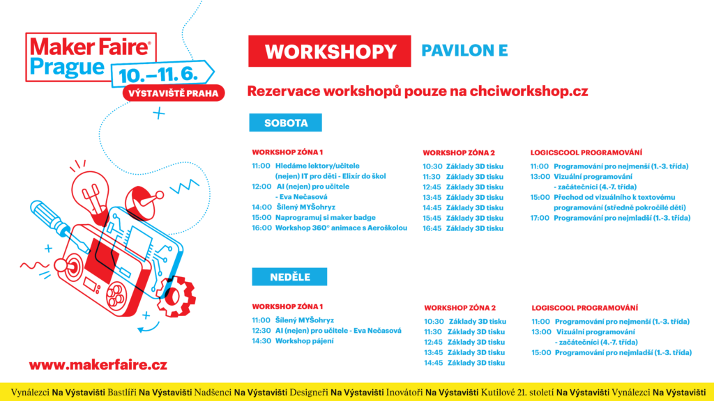 - Natiskni si merch – workshop sítotisku – Účastníci si budou moci natisknout technikou sítotisku vizuál letošního Maker Faire Prague a odnést si parádní limitovanou verzi merche. (sobota i neděle)