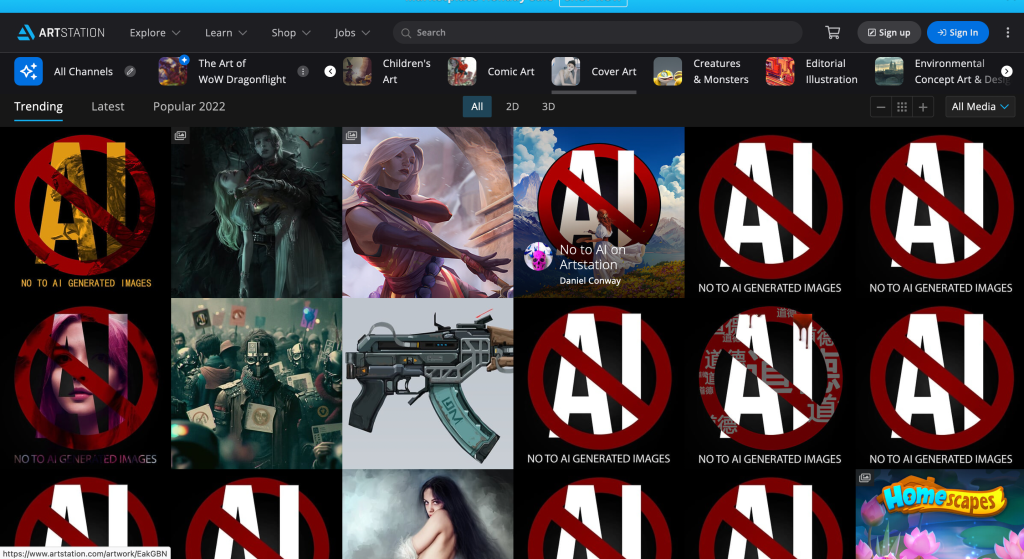 Někteří umělci výslovně odmítají postoupit své snímky společnostem vyvíjejícím umělou inteligenci. V roce 2022 vypukly na ArtStation a dalších uměleckých portálech protesty proti umělé inteligenci. Komunita DeviantArt reagovala tím, že umělcům umožnila označit svá díla “noai” (ne umělé inteligenci). Takto označená díla byla odhlášena z výzkumu třetích stran. DeviantArt také spustila aplikaci DreamUp, která trénuje pouze na obrázcích odsouhlasených jejich tvůrci. Více informací se dozvíte zde. -Keith Hammond
