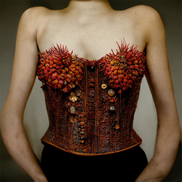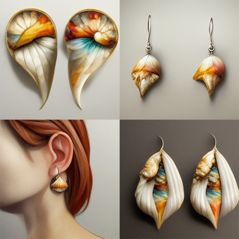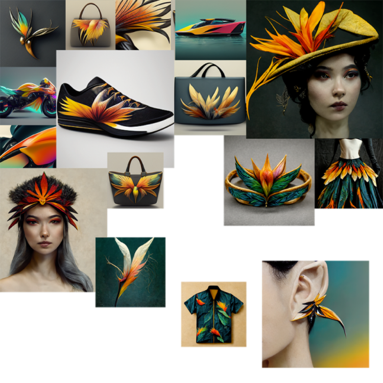 Mnoho tvůrců generativní umělou inteligenci uplatňuje již při tvorbě nápadů. Například používají Midjourney k vytváření konceptů na tabuli, které začínají objektem nebo libovolným konceptem, jako jsou náušnice z mušlí (obrázek K), móda ve stylu Ptáci z Ráje (obrázek L) nebo šaty z Rambutanu (obrázek M).