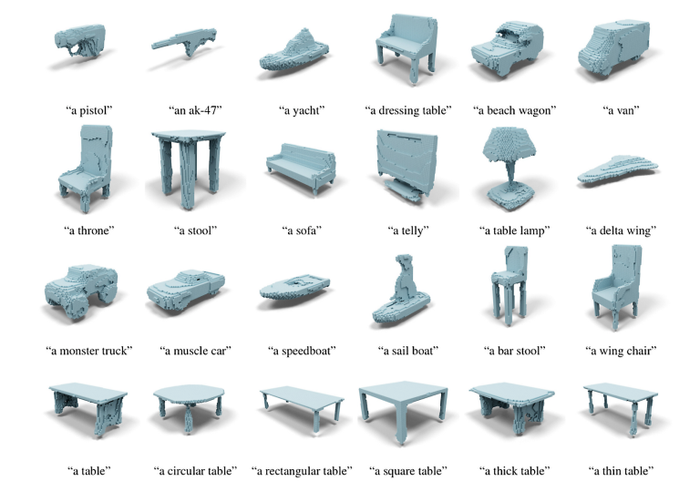 Obrázek N: 3D objekty generované pomocí programu CLIP-Forge společnosti Autodesk, Sanghi a kol., 2021