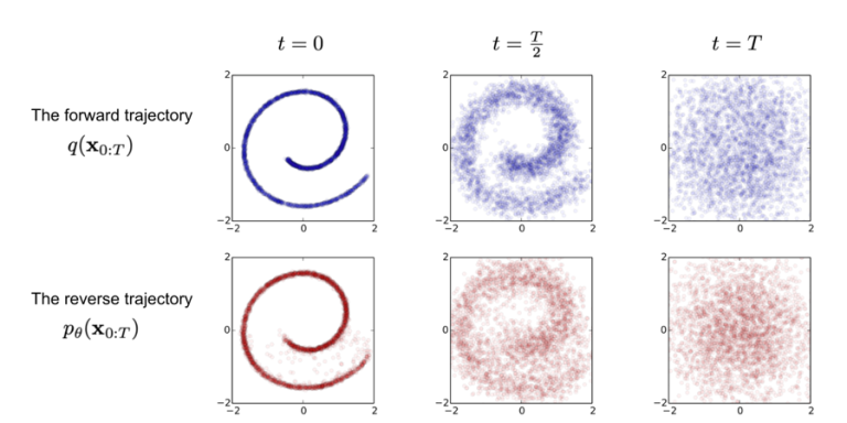 Klíčovým poznatkem je, že difuzní model se musí postupně naučit pravděpodobnost rozložení šumu pro různé kroky zpětné trajektorie (viz pθ na obrázku B).