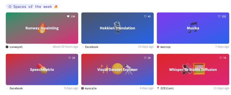 Příklady populárních Hugging Face Spaces, generativních aplikací umělé inteligence všeho druhu od uživatelů.