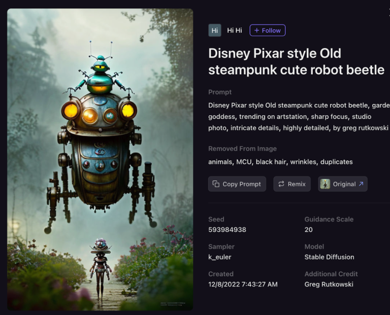 Obrázek G: Obrázek vytvořený umělou inteligencí sdílený s výzvou, která byla který byl použit k jeho vygenerování, s odkazem na styly společností Pixar a umělce Grega Rutkowského, na komunitě Playground AI.