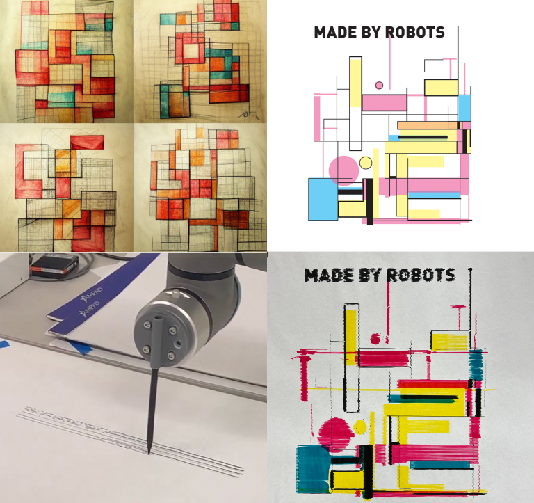 Difuzní modely používají studenti designu na CSU-Long Beach k vytváření uměleckých děl, které by mohl namalovat robot. Nejtěžším úkolem je vybrat styl kresby, který by byl robot (v tomto případě robotická ruka Universal Robots UR5E se štětcovými pery Tombo) schopen úspěšně namalovat. Pro tuto operaci byl zvolen nástroj CAD Grasshopper společnosti Rhino, který generuje topografický model obrázku. Model je definován na základě hodnot světlých a tmavých barev. Například v případě světlejších oblastí se robot zvedne směrem nahoru od stránky. K úpravě výsledků se používají nástroje Illustrator a Photoshop služby Adobe Creative Cloud.